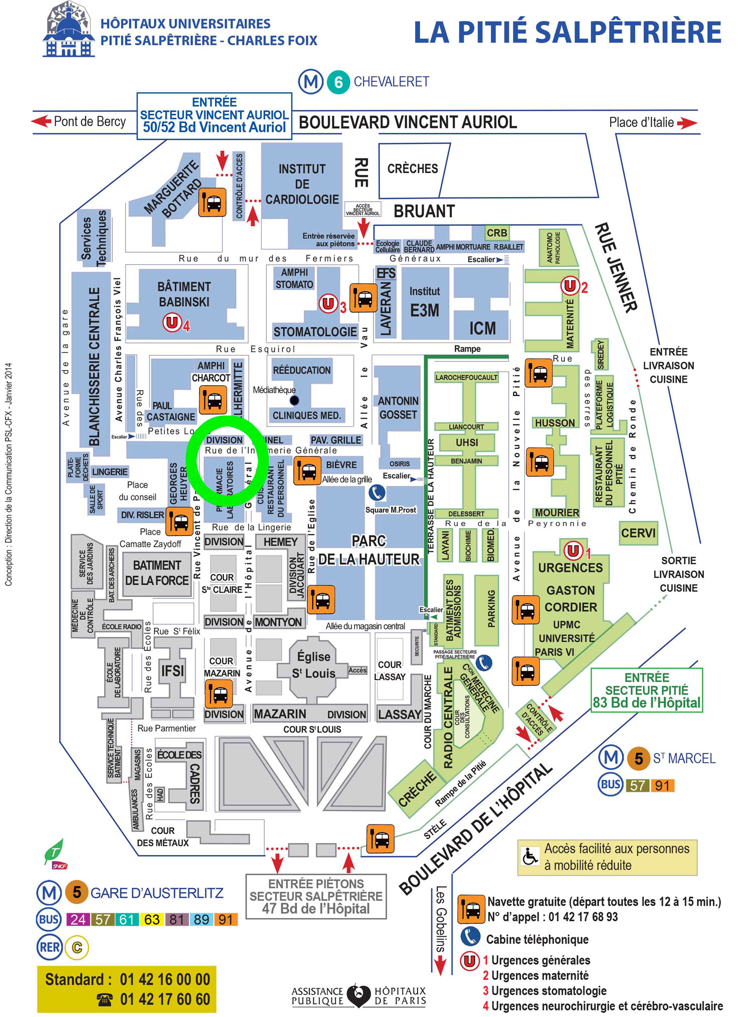 Accés : Cour des Consultations - 1er sous-sol Secteur Pitié et Bâtiment Gaston Cordier - Rez-de-Chaussée Secteur Pitié |